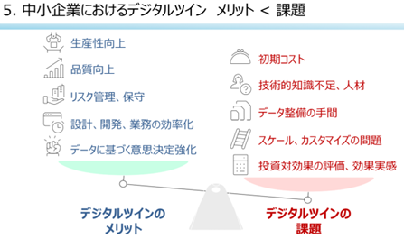 一方で、普及に向けた課題として、データ形式の統一やリアルタイム処理といった技術的な側面に加え、高額な初期投資・運用コスト、専門知識を持つ人材の不足などが挙げられ、これらが中小企業にとって導入の障壁となっています。